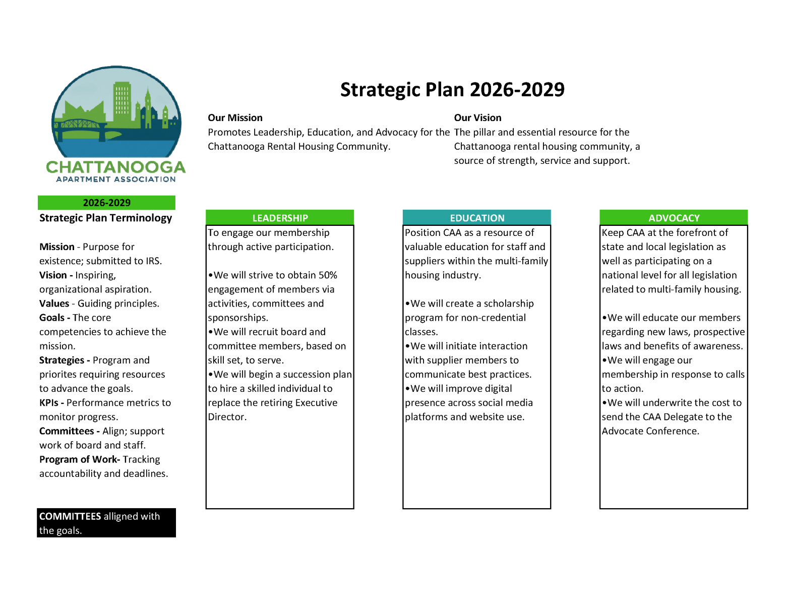 The Chattanooga Apartment Association (CAA) is a 501c(6) corporation (not-for-profit) trade association serving the interests of the rental housing industry. CAA offers quality educational programs, local advocacy support, and networking opportunities.